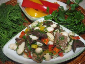 Фасоль замочить на ночь в воде затем отварить в подсоленной воде; грибы также замочить на несколько часов в воде, а затем отварить в подсоленной воде; перец порезать тонкой соломкой; чеснок измельчить; укроп и петрушку мелко порезать, добавить соль, подсолнечное масло все перемешать.